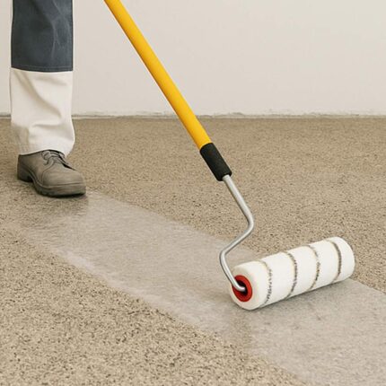 B471 wird mit einer nicht flusenden und kurzfloorigen Farbrolle aufgetragen. Schütten Sie das Material nicht auf den Boden aus, sondern rollen Sie aus dem Eimer heraus. Wir empfehlen mindestens einen zweischichtigen Versiegelungsvorgang. Die Verarbeitungszeit beträgt ca. 30 Minuten (bei 20°C) Bei Temperaturen ab 20°C sinkt die Topfzeit! Das Ende der Verarbeitungszeit kündigt sich deutlich durch einen Viskositätsanstieg an. Bei einer zweifachen Versiegelung kann auf
