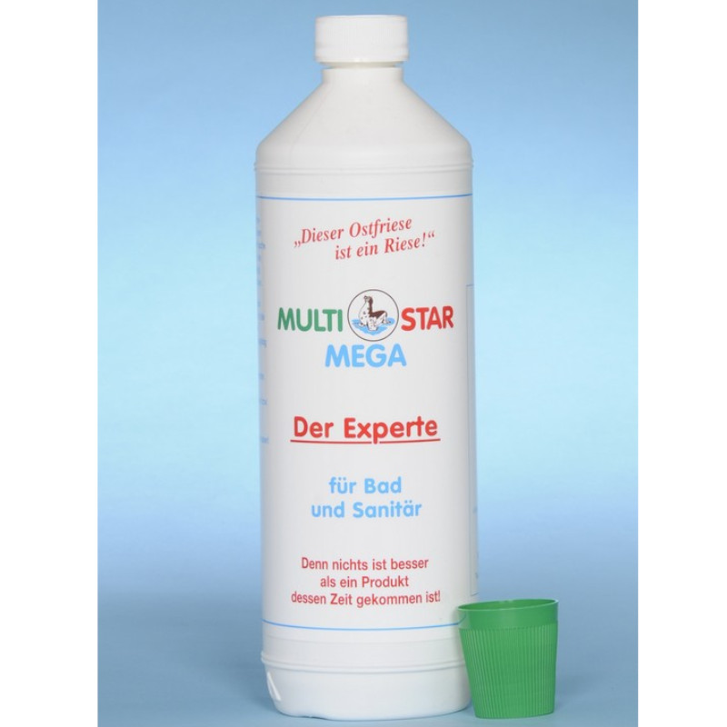 Mit Multi-Star MEGA entfernen Sie Kalk von Duschtrennwänden, Armaturen, Fliesen, Badewannen, Urin und Wasserstein aus Toilette und Pissoir.